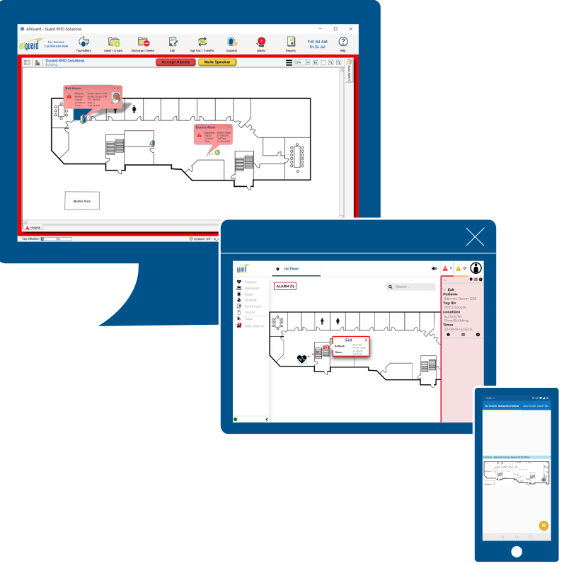 The GuardRFID RTLS solution includes the use of the AllGuard software. Users can access the software from a desktop computer, web browser or mobile device for added flexibility.